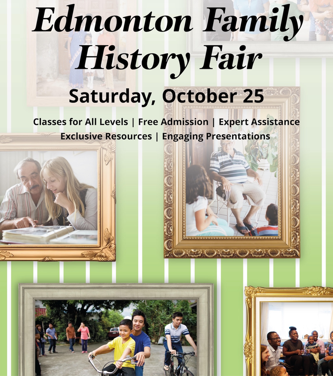 The Church of Jesus Christ of Latter-day Saints and Alberta Genealogical Society Edmonton Branch have collaborated to present a one-day FREE Family History Fair on Saturday, October 25th from 9:00 am to 4:10 pm, at the Church located at 14325 – 53 Ave NW, Edmonton. An exciting lineup of classes over a variety of topics presented by experienced researchers will provide valuable and helpful direction for your genealogy journey. Saturday, October 25th 14325 – 53 Ave NW |